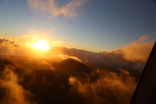 Along the flight path back to Kona, the sun drops low into the sea, projecting its colorful exit onto the clouds that lay scattered above the ocean, defining the colors of the deeper shades of the ocean’s blue while illuminating the yellows, reds and fading colors of the day.