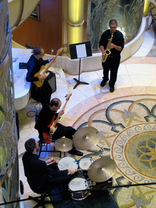 I usually ordered fresh fruit and coffee delivered to my room every morning and a pot of hot water for my French press mug and personal stash of Pete’s coffee. I’d sit back in a chair, put my feet up against the skidding glass door out of the wind, sip and wake up to the beauty of the ocean white caps. Melissa and Zoe ate in the Horizon Court buffet, as did my parents. Lunch was usually downstairs where we snacked on sandwiches at the central café and watched the other cruisers walking around the open atrium or dancers taking center stage between the long columns of glass elevators beautifully encased with decorative metal art. This area was Zoe’s favorite place to people watch from the top balcony looking down to the floor where we often ate our lunch. She thought the area beautifully designed and the perfect set for the ballroom dance couple that drew the attention and fired the imagination of all.